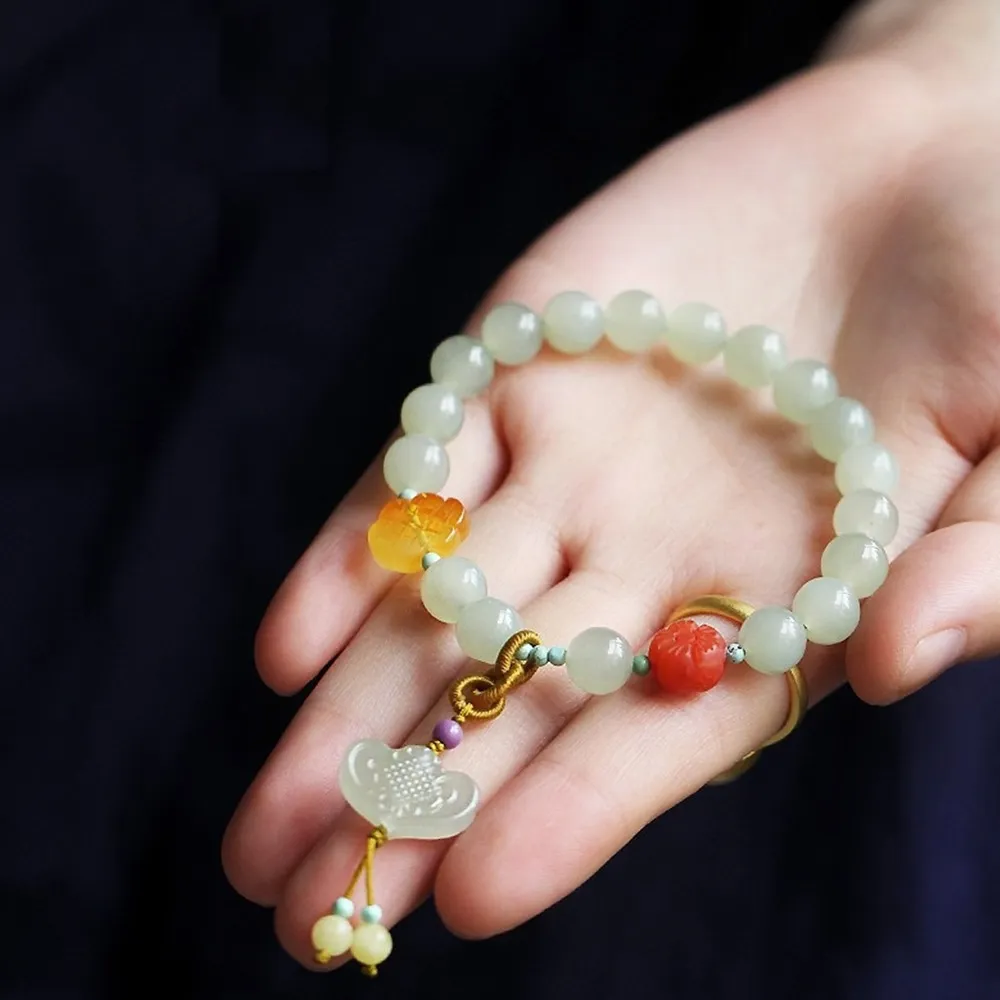 8mm 溫潤和田玉手珠,細緻圓潤光澤柔雅,點綴彩玉與吉祥墜飾,寓意平安順遂、福氣相隨。