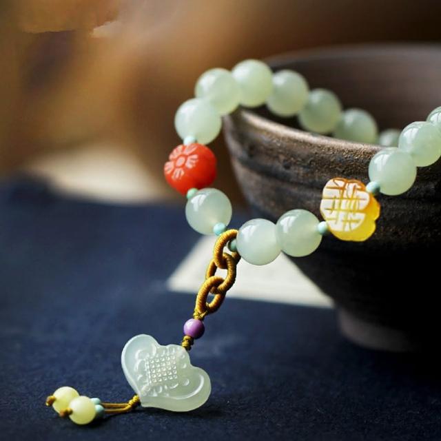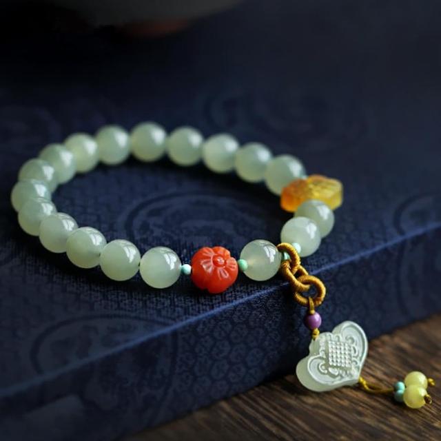 8mm 溫潤和田玉手珠,細緻圓潤光澤柔雅,點綴彩玉與吉祥墜飾,寓意平安順遂、福氣相隨。日常配戴低調優雅,展現內斂氣質與東方美感,送禮自用皆具收藏價值。